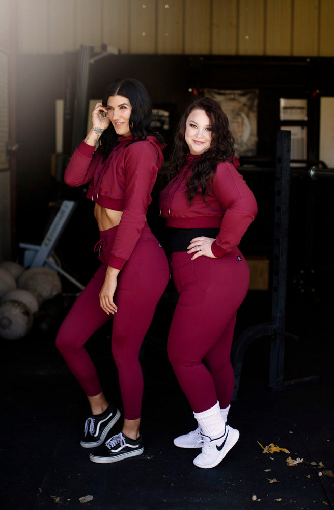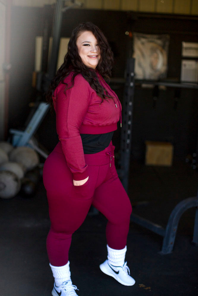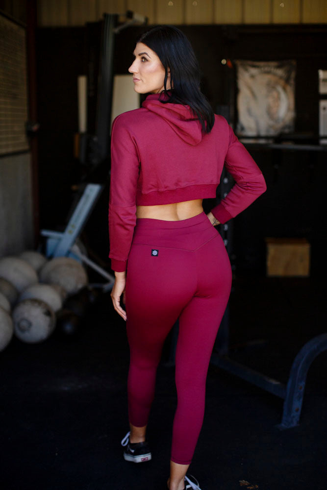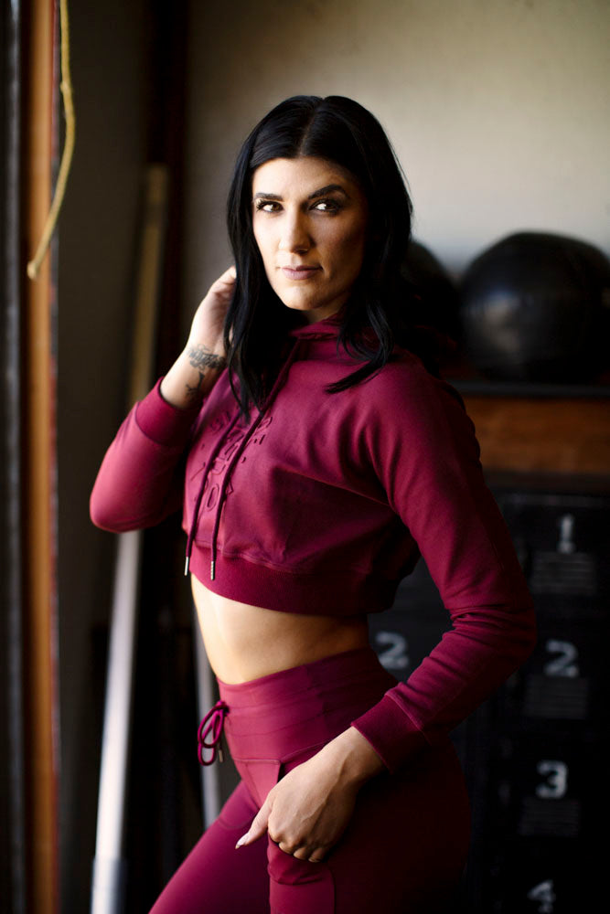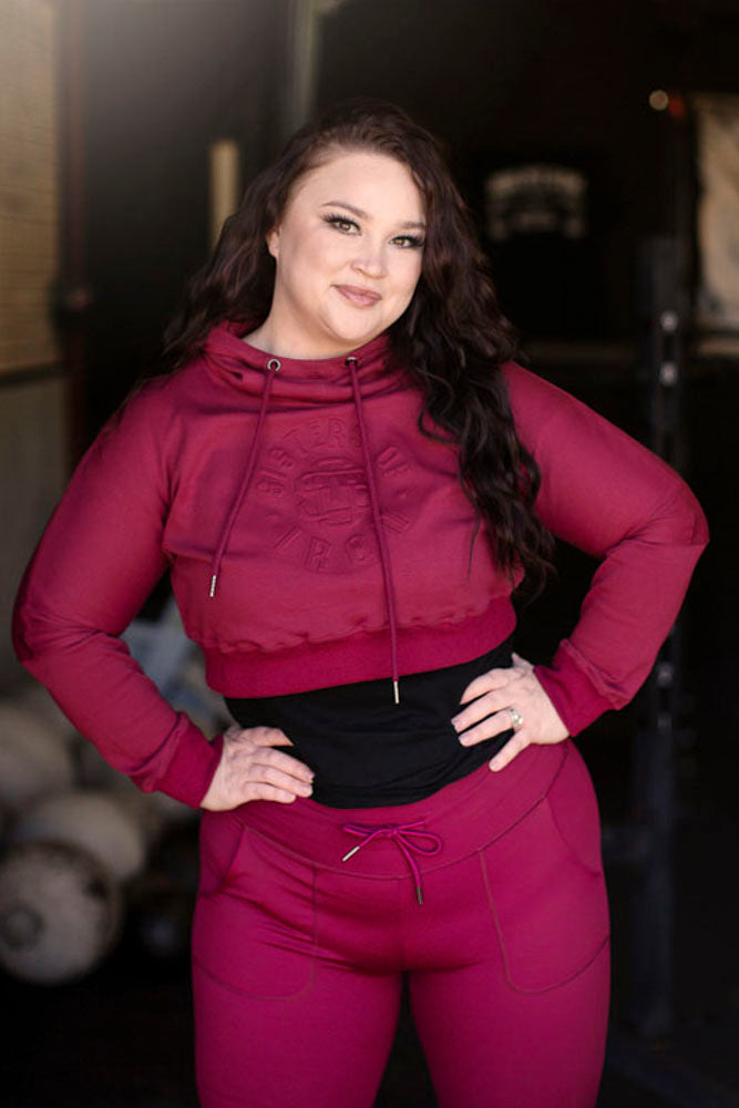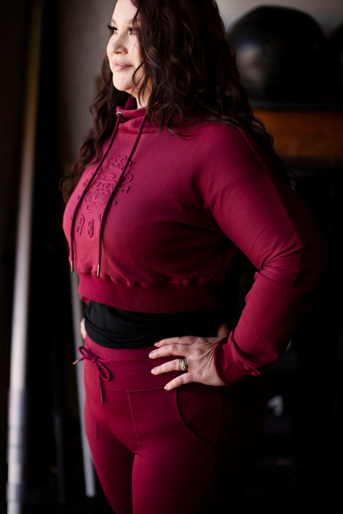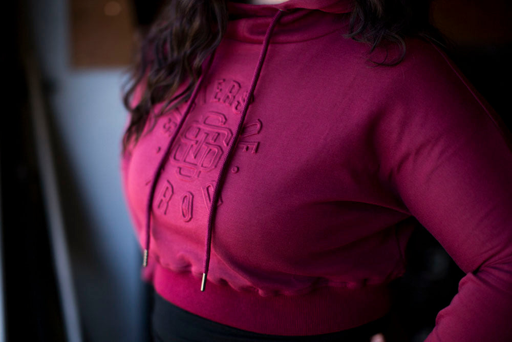 The new SOI crop hoodie is in a stunning burgundy color. Featuring a unique embossed graphic.