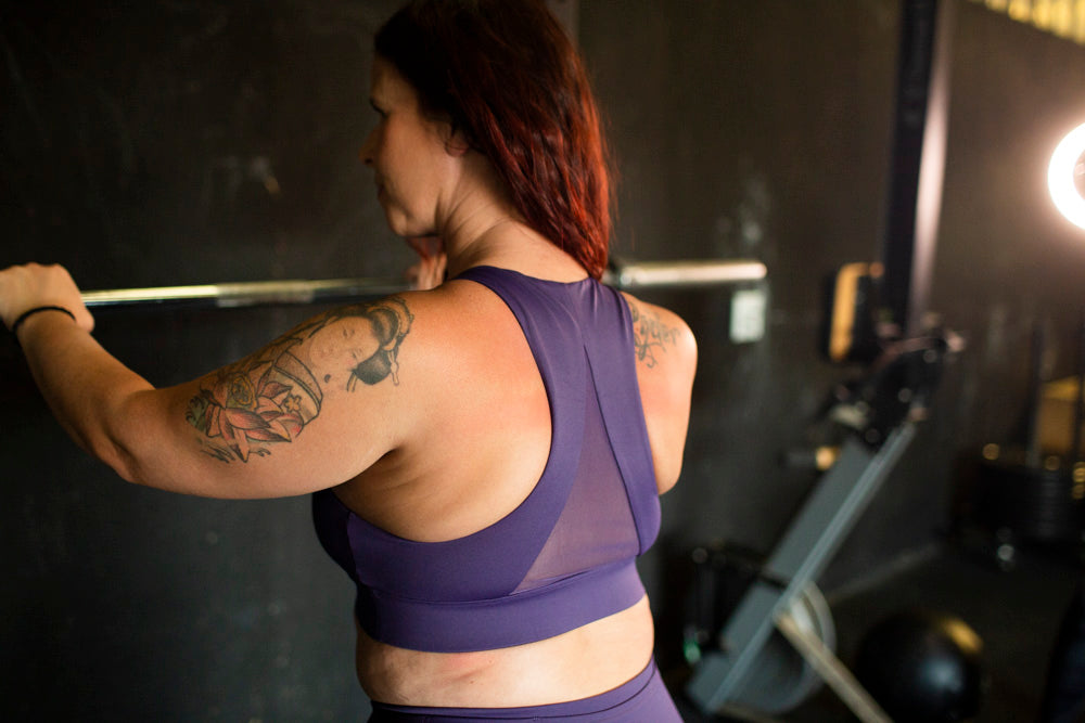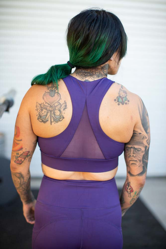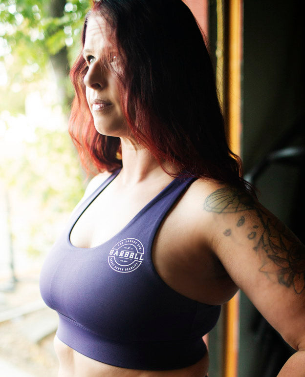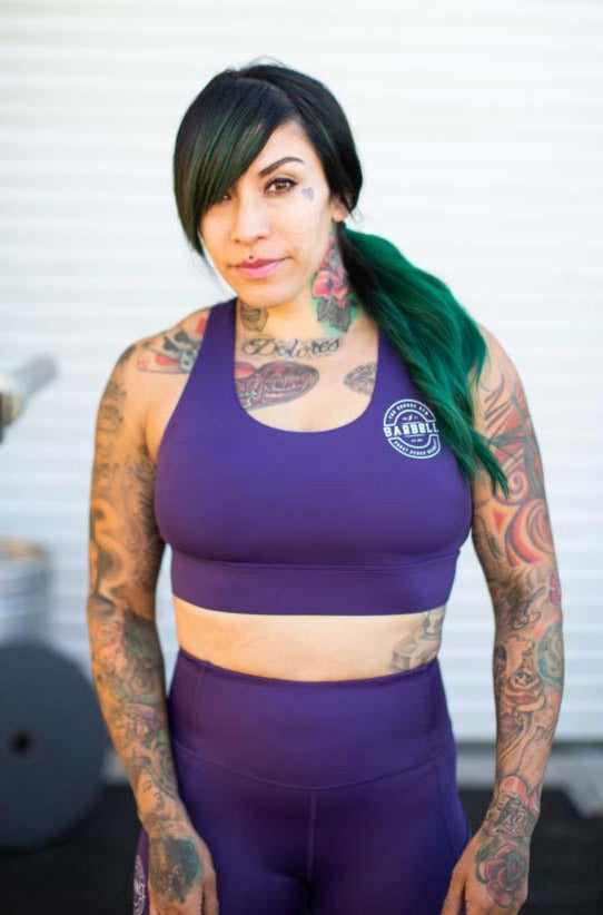 GGB's first custom-designed sports bra is here! Pure freedom. The Strong & Free collection, is about weightless coverage and unrestricted movement. Soft purple color featuring our "Barbell Badge" logo. Pair up with our matching high waist leggings