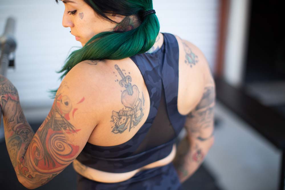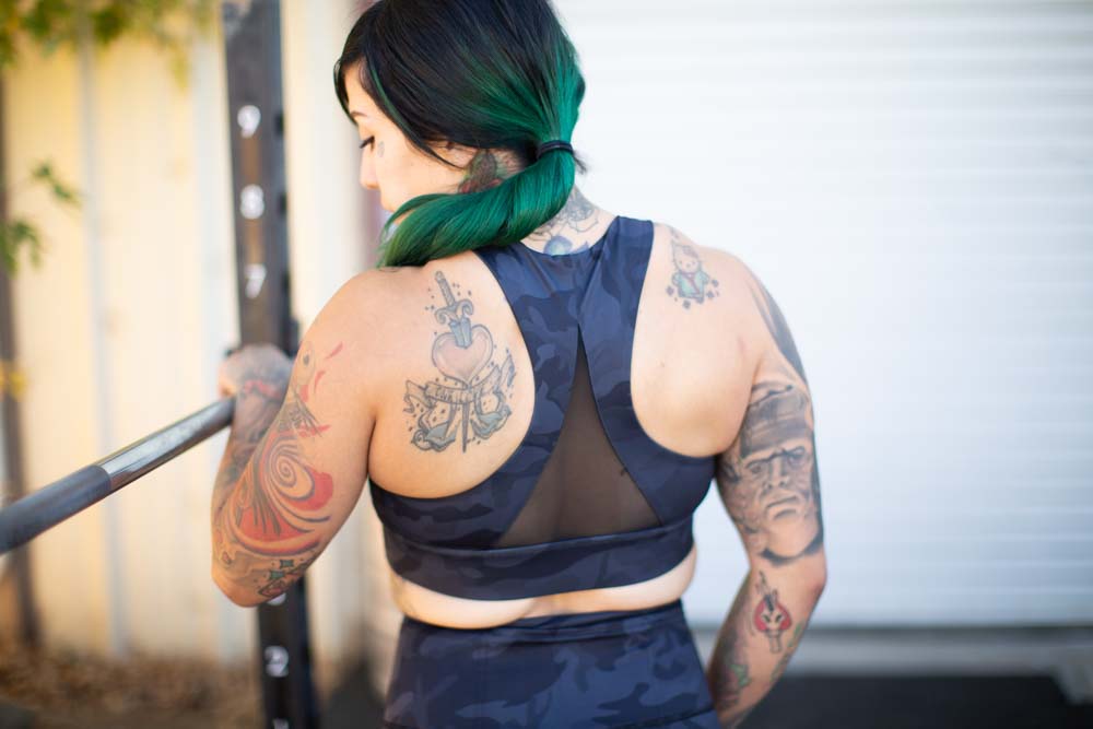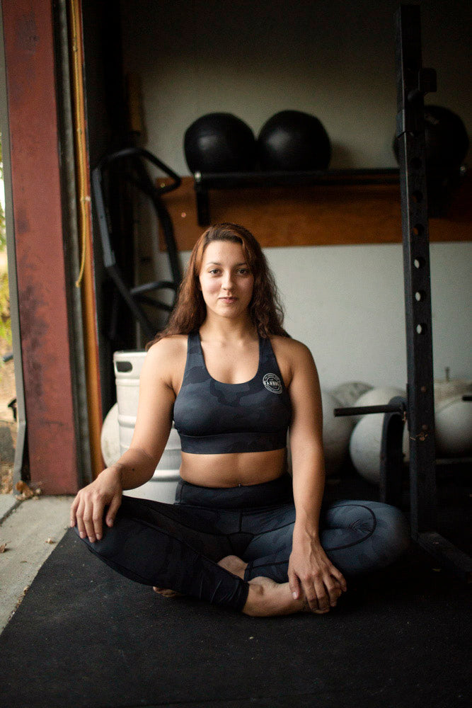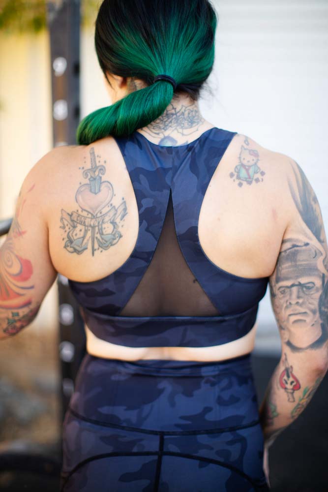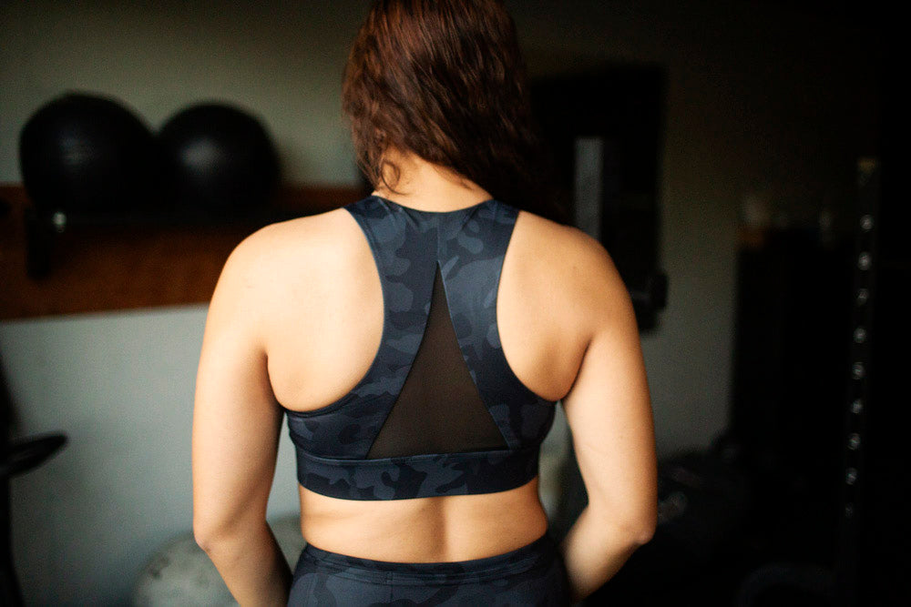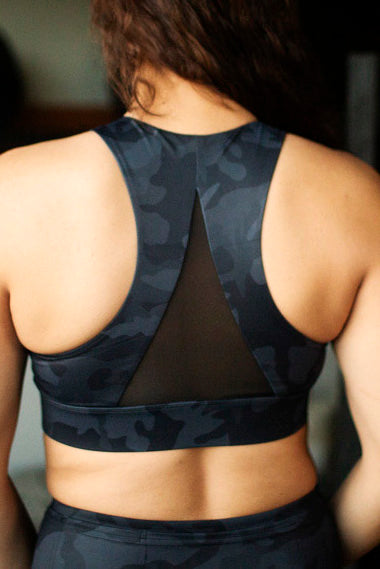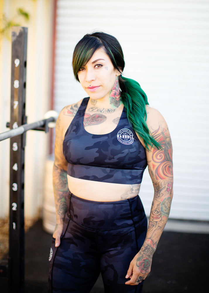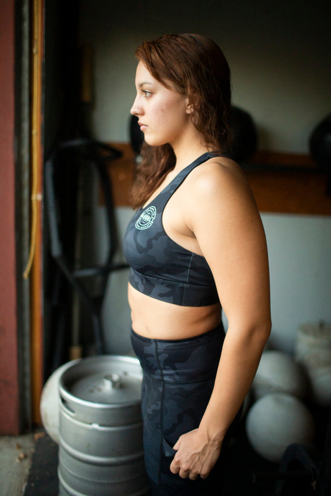 First off, this sleek black camo will grab all your attention and featuring our "Barbell Badge" logo. Pair up with our matching high waist leggings