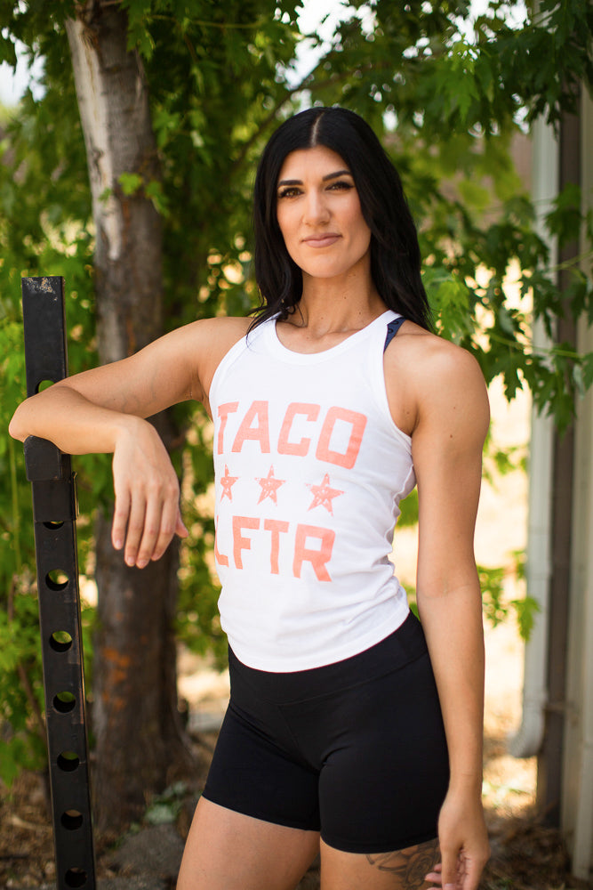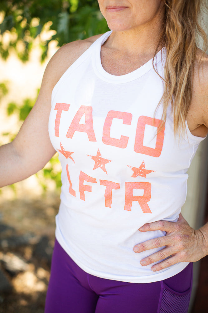 How to measure for sizing- grab your favorite tank or tee, measure width on front side only